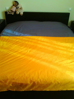 I wanted a cover that would bring the Sun into the house, since our bedroom furniture is very dark and we only have a small window. Even though I love white sheets, I don't like the idea of the duvet cover being white as well. I want my house to be functional and pleasant, and a white cover would involve too much work in maintenance. So white was not an option.